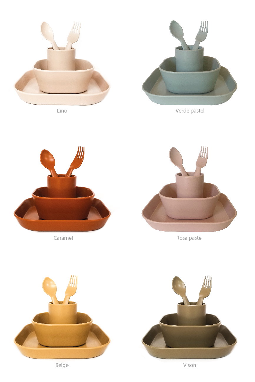 Medidas: plato 185mm, cuenco 125mm, vaso 80mm, cuchara y tenedor 160mm