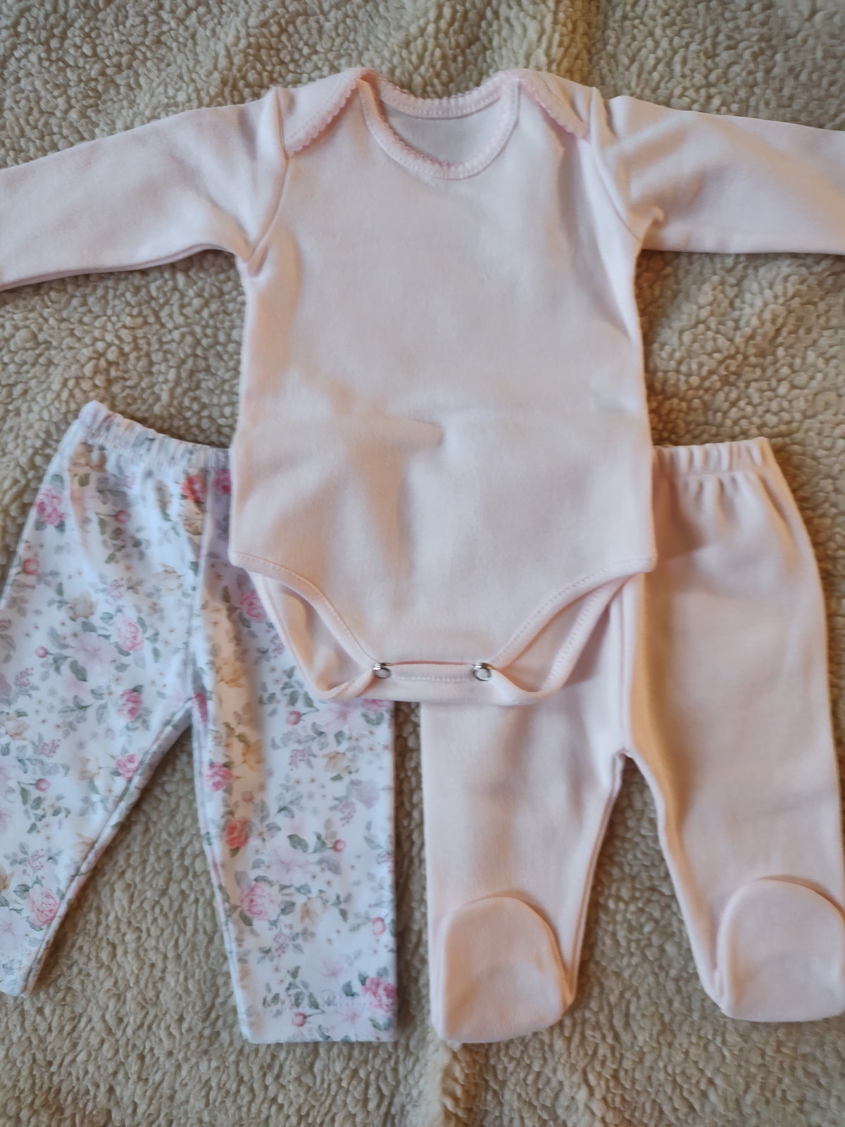 Ajuar compuesto por body con delicado detalle de picot en el cuello y ranita de interlock 100% algodón ,color rosa pastel.