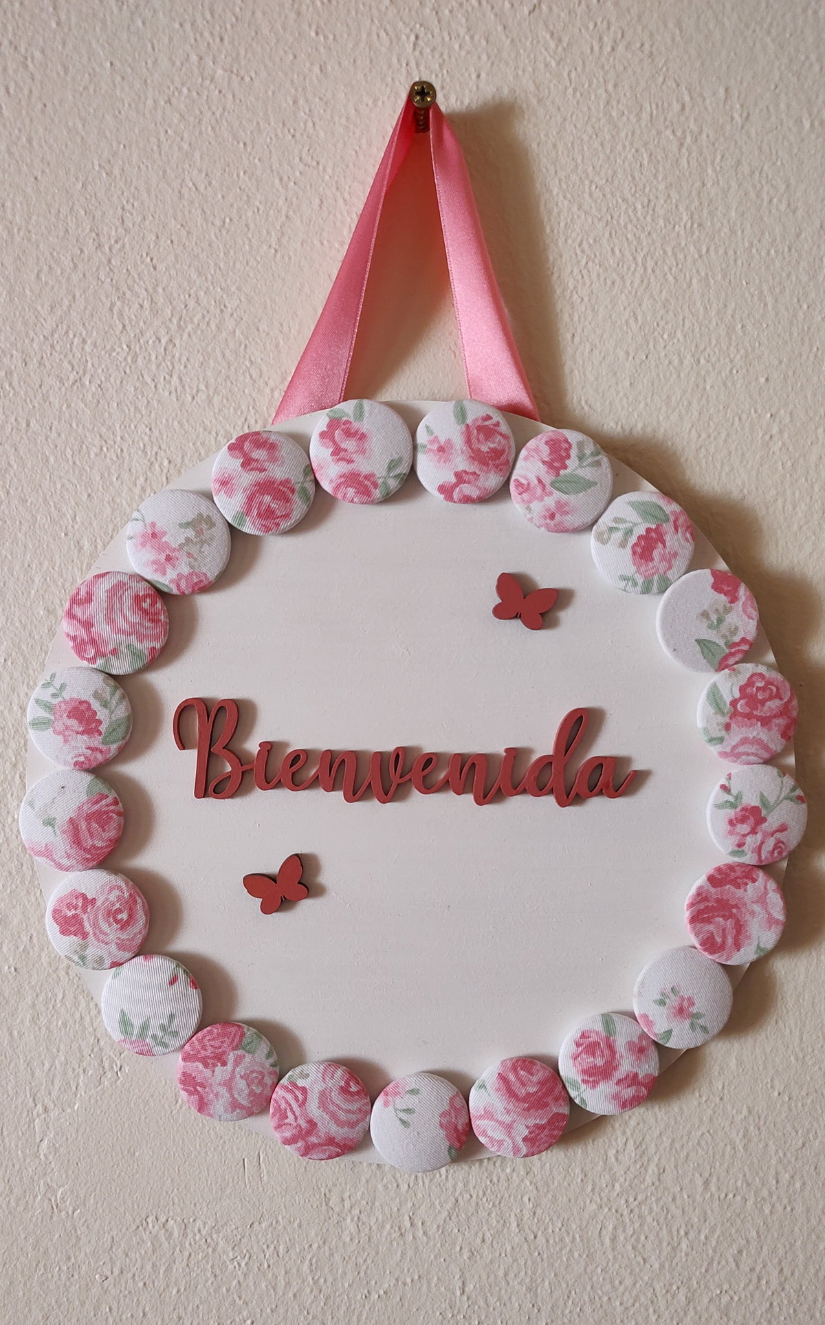 Decorado con botones forrados en tela, con motivo de flores en tonos rosa.